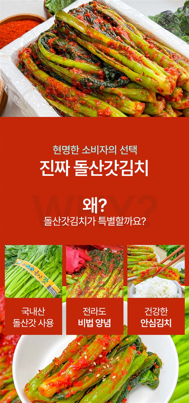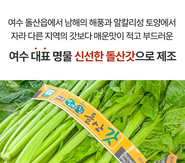 절임갓75%(갓95%:국내산,식염5%:국내산), 고춧가루11%(국내산), 건고추4%(국내산), 까나리액젓3%(까나리65%:국내산,잡어10%,식염25%:국내산), 식염(국내산), 양파(국내산),무(국내산), 다시마, 디포리(국내산), 대파(국내산), 찹쌀(국내산), 새우젓(국내산), 마늘(국내산), 설탕, 생강(국내산) *새우 함유 |