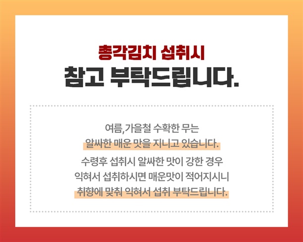 절임알타리무81.1%[(총각무93%(국내산),천일염1%(국내산),정제소금3%,정제수3%)] 절임열무9.5%[(열무93%(국내산),천일염1%(국내산),정제소금3%)]김칫속7.2%(택배용양념)[고춧가루(국내산),찹쌀풀,멸치젓,멸치액(멸치액젓/국내산),젓새우(새우젓/국내산),마늘,양파,생강,물엿,설탕,정제수],설탕0.4%,파0.7%,새우젓0.51%,고춧가루0.27%,마늘0.32% 【새우함유】 |
