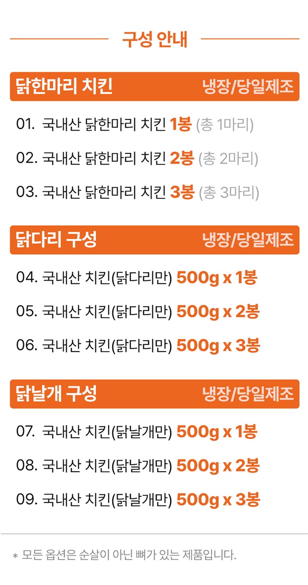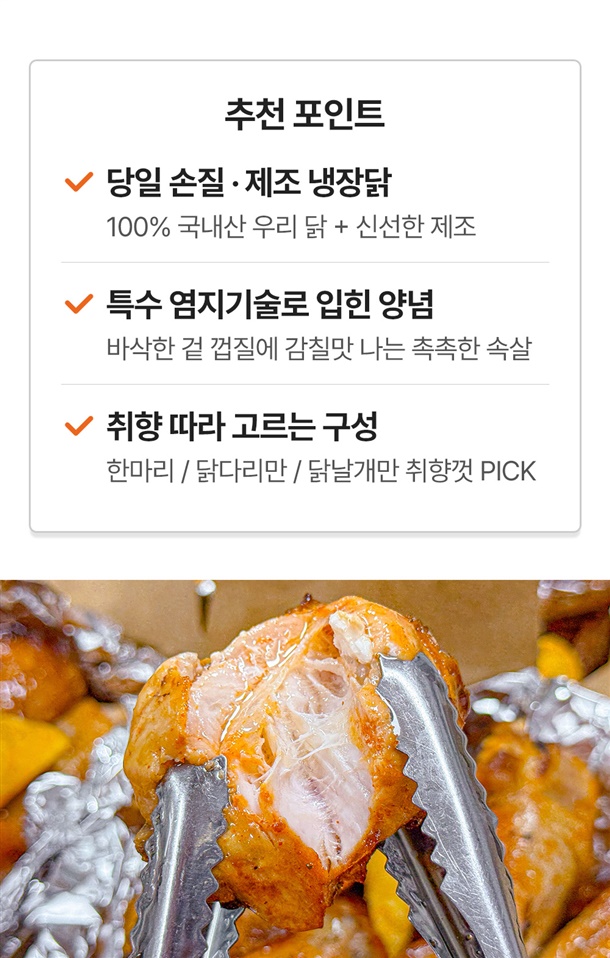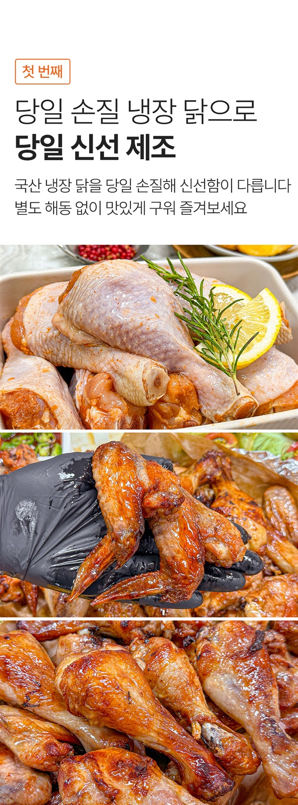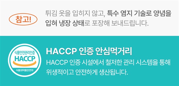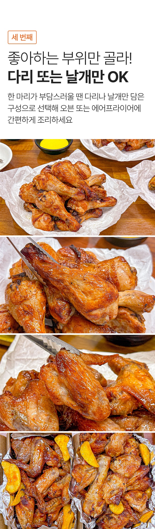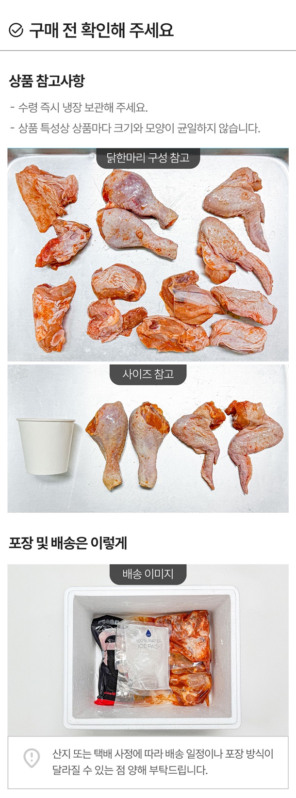 · 냉장제품이므로 보관에 유의하시기 바랍니다. · 개봉한 제품은 변질될 우려가 있으니 가능한 한 빨리 조리하십시오. · 조리 시 화상을 입을 수 있으니 주의하시기 바랍니다. · 마녀치킨 닭 한마리 - 이 제품은 알류, 땅콩, 메밀, 게, 새우, 돼지고기, 복숭아, 토마토, 아황산류, 호두, 닭고기, 조개류, 쇠고기, 잣을 사용한 제품과 같은 제조 시설에서 제조하고 있습니다. · 조리방법 - 예열된 에어프라이어 200C 24분 조리해 주세요. · 본 제품은 공정거래위원회 고시 소비자 분쟁 해결 기준에 의거 교환 또는 보상을 받을 수 있습니다. · 부정, 불량식품 신고는 국번 없이 1399