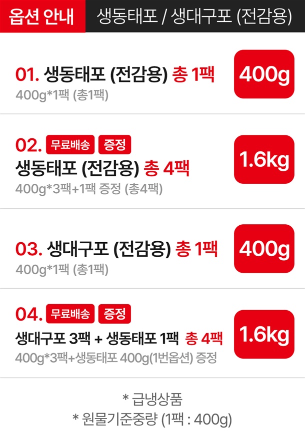 냉동 대구포: ㆍ상온에서 자연 해동 후 가열기구를 활용하여 용도에 맞게 조리하여 섭취하고 반드시 익혀서 섭취하여야 합니다. ㆍ이미 냉동된 바 있으니 해동 후 재냉동 시키지 마십시오. / 냉동 명태필렛: ㆍ자연해동 후 명태전 등 기호에 맞게 드시기 바랍니다. ㆍ이미 냉동된 바 있으니 해동 후 재냉동시키지 마시길 바랍니다.