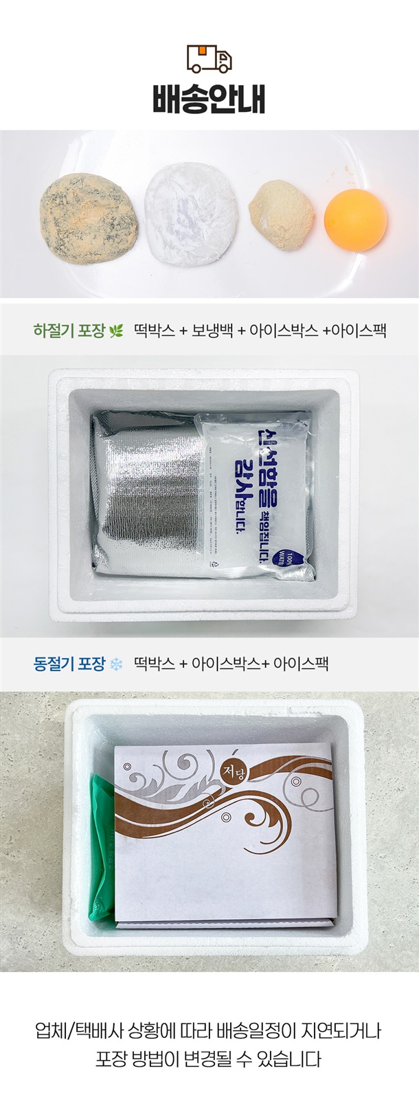 | 상품구성 및 내용량 | 찹쌀떡 1박스(맛보기/60gx12개)/ 찹쌀떡 1박스(60g×30개)/ 앙금 인절미1박스(40g×42개) / 콩쑥개떡(쑥떡)1박스(맛보기/60gx12개) / 콩쑥개떡(쑥떡)1박스(60g×30개) /수라간3종세트(찹쌀떡 30개+인절미 42개+콩쑥개떡 30개/각1박스 ,총 3박스) |