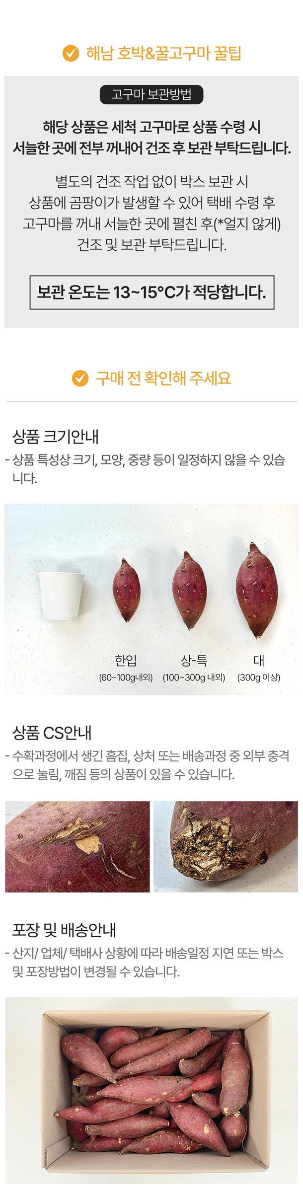 ㆍ배송 과정에서 습기가 찰 수 있으므로 수령 즉시 개봉하여 고구마의 상태를 확인해 주세요. ㆍ냉장보관은 추천드리지 않으며, 직사광선을 피해 그늘진 곳, 통풍이 잘되는 곳에 신문지를 깔고 고구마를 넓게 펼쳐 보관해 주세요. ㆍ세척고구마로 빨리 상하거나 얼지 않게 건조 및 보관에 신경 써 주세요. ㆍ보관 시 싹이 난 고구마는 싹을 떼어내고 제거해 드시면 됩니다.