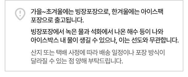 - 배송일 지정은 불가하며 산지에서 순차적으로 출고됩니다. 배송 메시지는 배송 시 택배기사에게 전달되는 사항으로 날짜가 기재 되어있어도 지정일 배송이 어렵습니다.