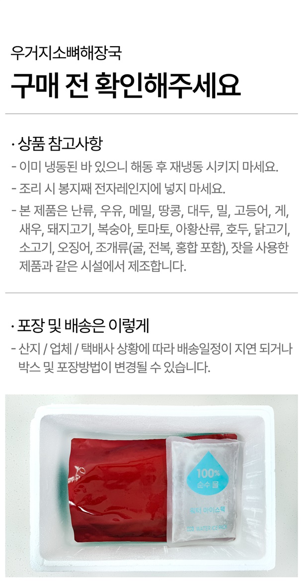 얼큰 소뼈해장국: 소목뼈(미국,호주)31.1%, 우거지(국내산)6.7%, 소스(맑은탕육수)0.8%, 소스(비프엑기스)0.7%, 고춧가루(중국산), 복합조미식품(실속다시), L-글루탐산나트륨, 간마늘(중국산), 간양파, 혼합장(신주일미된장), 핵산, 후춧가루(베트남산), 정제수57.9% *쇠고기, 대두, 밀 함유 / 맑은 소뼈해장국: 소목뼈(미국,호주)31.1%, 우거지(국내산)6.7%, 소스[비프엑기스(쇠고기-호주산)]1.7%, 간마늘, 혼합장(신주일미된장), 정제소금, 후춧가루, 정제수59.6% *쇠고기, 대두, 밀 함유 |
