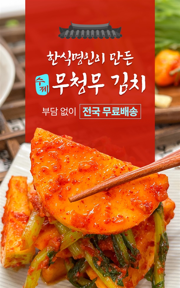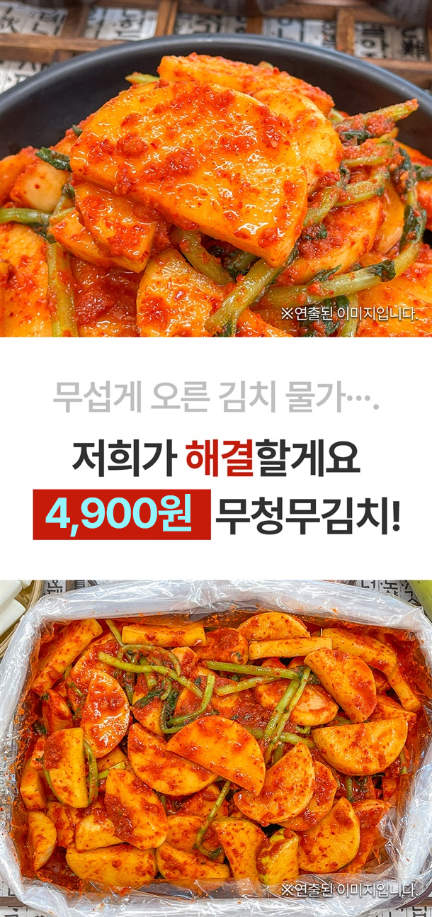 무(국내산)70%, 꽃게육수5%, 고춧가루(국내산,중국산(해썹))5%, 새우(베트남산)2%, 마늘(국내산)1%, 생강(국내산)1%, 양파(국내산)2%, 액젓(국내산)1%, 과당3%, 사과4%, 당근(국내산,수입산)1%, 무(국내산)3%, 청양고추(국내산)1%,천일염(호주산)1% |