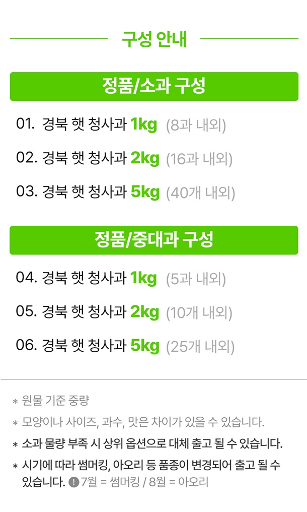 상품구성 1kg(소과/중대과),2kg(소과/중대과),5kg(소과/중대과)