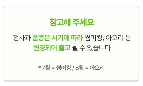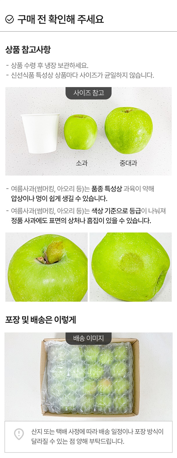 소비자안전을 위한 주의사항 *소과 물량 부족 시 상위 옵션으로 대체 출고 될 수 있습니다. / *품종은 시기에 따라 썸머킹, 아오리 등 변경되어 출고 될 수 있습니다. *7월 = 썸머킹 / 8월 = 아오리