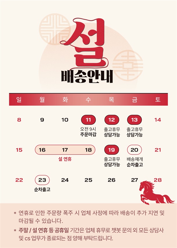 배송일은 결제 다음 날부터 평일 기준 2~4일 정도 소요됩니다. 주문 폭주나 산지, 택배 상황에 따라 추가로 지연될 수 잇습니다.