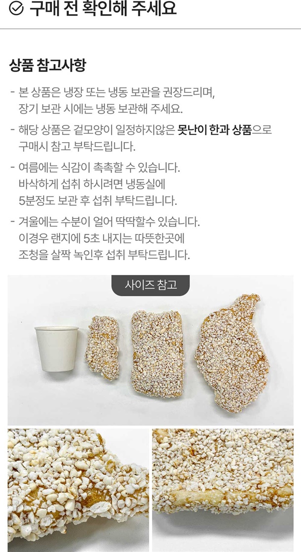 *여름에는 식감이 촉촉할수 있습니다 바삭하게 섭취 하시려면 냉동실에 5분정도 보관후 섭취 부탁드립니다. / *겨울에는 수분이 얼어 딱딱할수 있습니다. 이경우 랜지에 5초 내지는 따뜻한곳에 조청을 살짝 녹인후 섭취 부탁드립니다. |