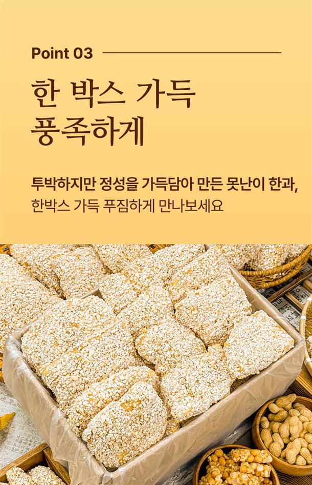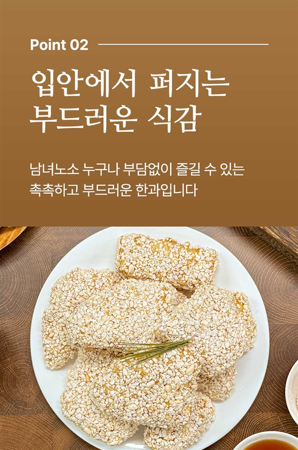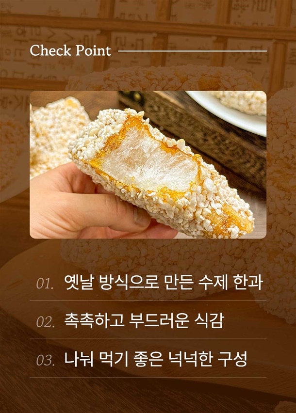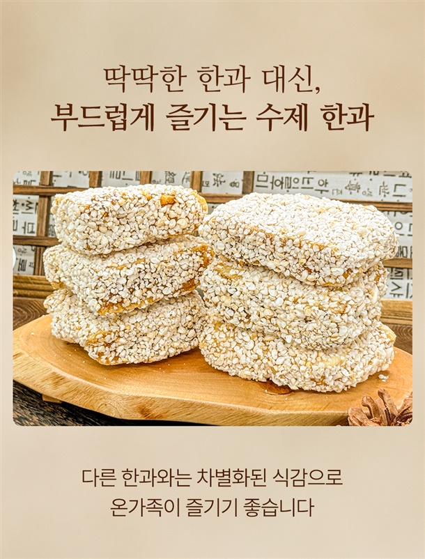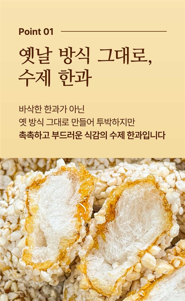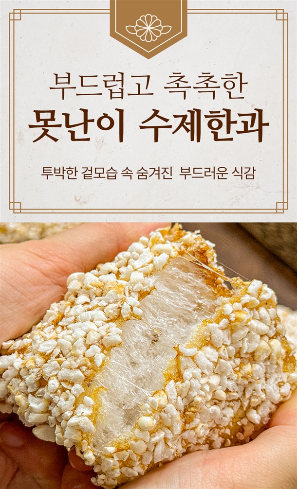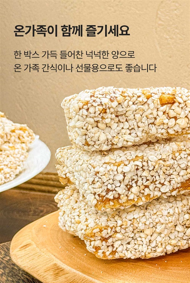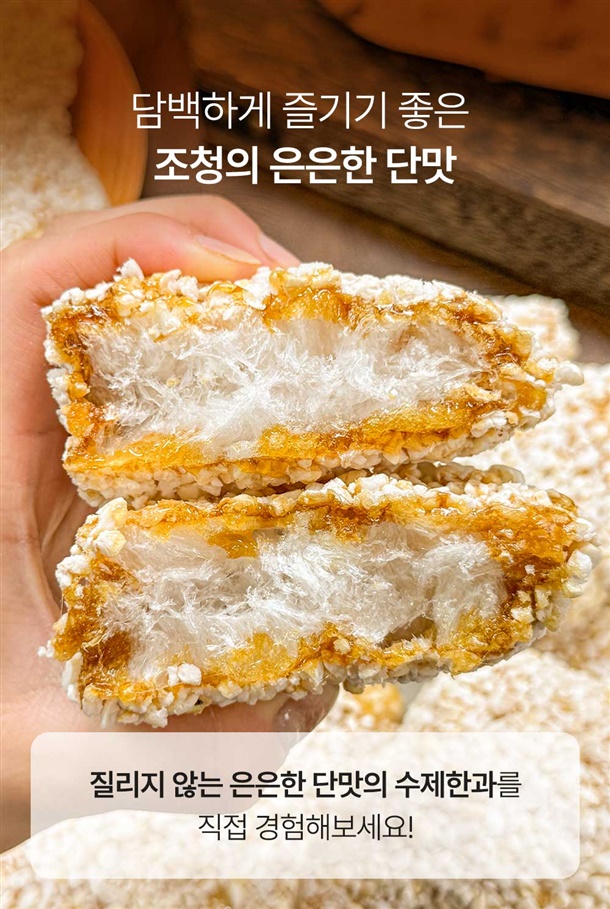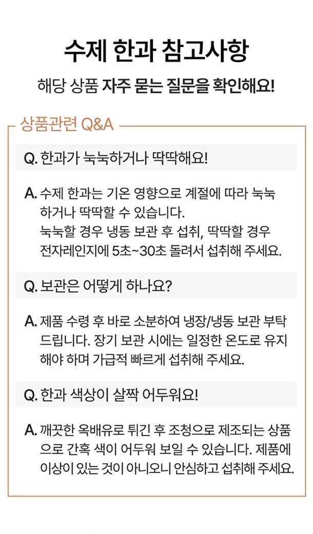 소비자안전을 위한 주의사항 *여름에는 식감이 촉촉할수 있습니다 바삭하게 섭취 하시려면 냉동실에 5분정도 보관후 섭취 부탁드립니다. / *겨울에는 수분이 얼어 딱딱할수 있습니다. 이경우 랜지에 5초 내지는 따뜻한곳에 조청을 살짝 녹인후 섭취 부탁드립니다.