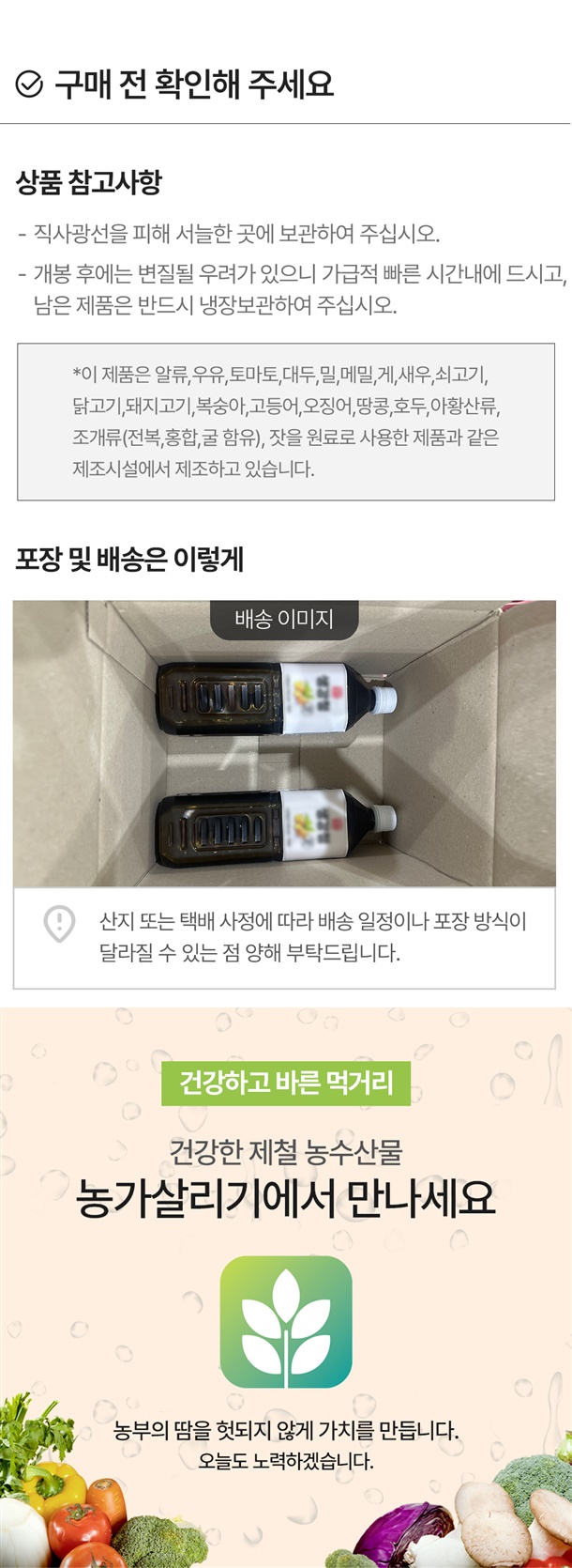 ㆍ이 제품은 알류,우유,토마토,대두,밀,메밀,게,새우,쇠고기,닭고기,돼지고기,복숭아,고등어,오징어,땅콩,호두,아황산류,조개류(전복,홍합,굴 함유), 잣을 원료로 사용한 제품과 같은 제조시설에서 제조하고 있습니다. ㆍ직사광선을 피해 서늘한 곳에 보관하여 주십시오. ㆍ개봉 후에는 변질될 우려가 있으니 가급적 빠른 시간내에 드시고, 남은 제품은 반드시 냉장보관하여 주십시오.