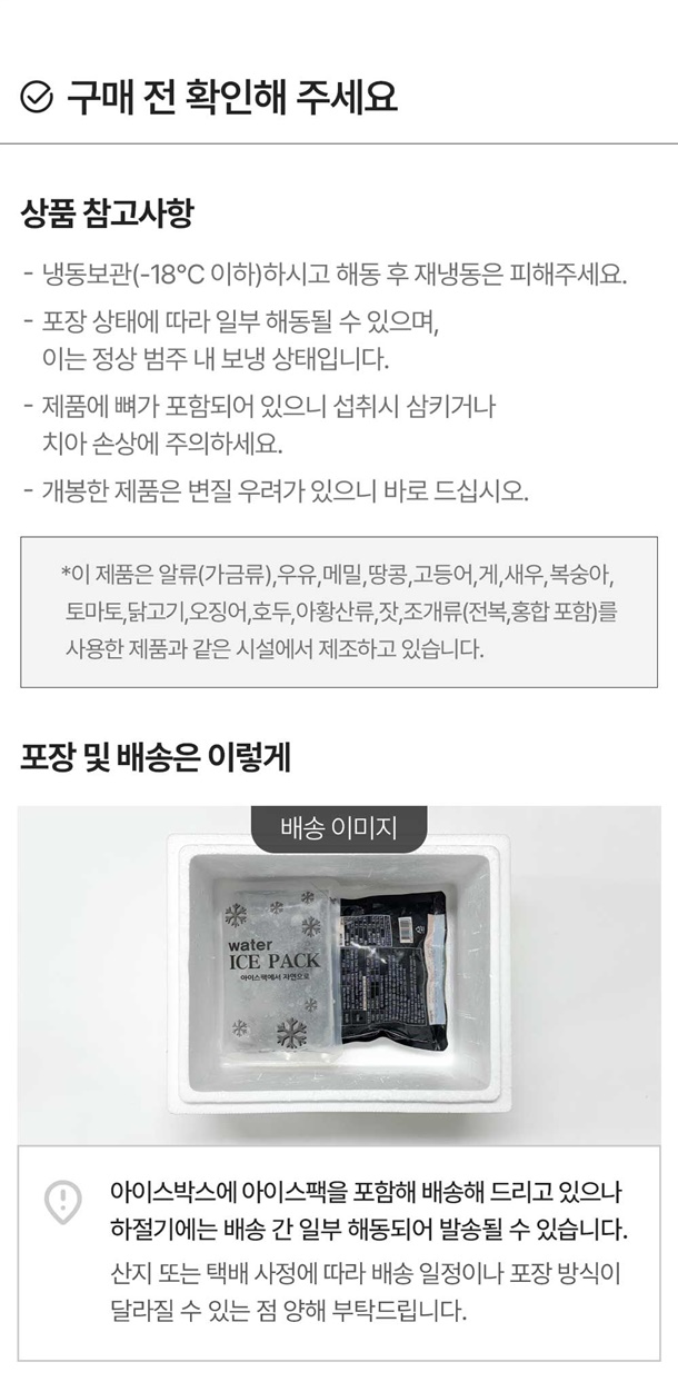 ㆍ이미 냉동된 바 있으니 해동 후 재동결시키지 마시길 바랍니다. ㆍ이 제품은 알류(가금류),우유,메밀,땅콩,고등어,게,새우,복숭아,토마토,닭고기,오징어,호두,아황산류,잣,조개류(전복,홍합 포함)를 사용한 제품과 같은 시설에서 제조하고 있습니다. ㆍ제품에 뼈가 포함되어 있으니 섭취 시 삼키거나 치아 손상에 주의하시길 바랍니다. ㆍ알레르기 유발할 수 있는 원료를 표시 하였으니 확인 후 드시기 바랍니다. ㆍ심한 충격을 피하고 개봉한 제품은 변질 우려가 있으니 바로 드십시오. ㆍ조리 시 안전사고에 주의하세요. ㆍ상품 조리 시나 조리 후 바로 드실 경우 상품이 뜨거울 수 있으니 화상에 주의하십시오.
