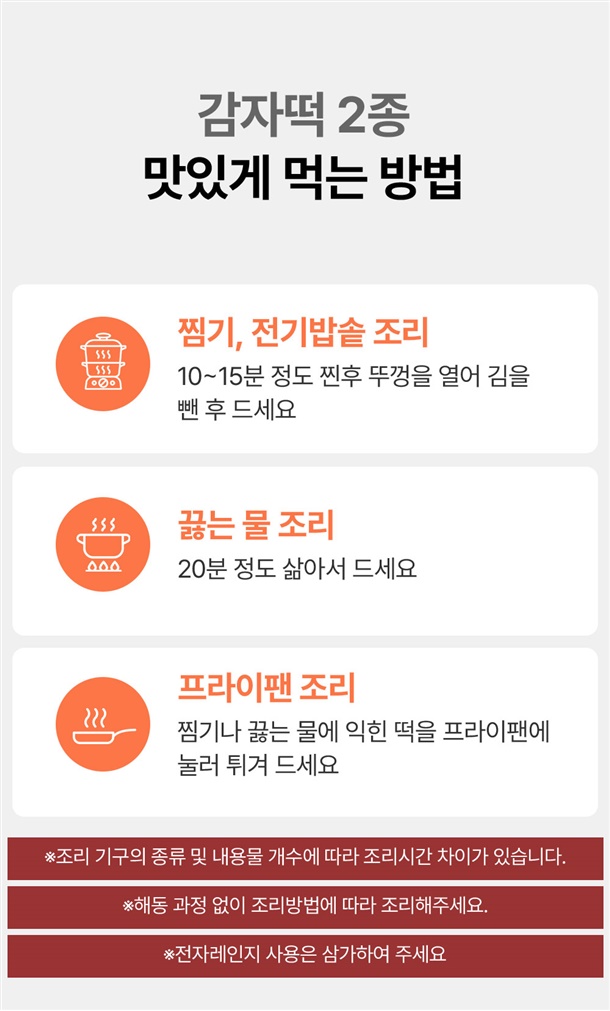 ㆍ이 제품은 우유, 계란, 땅콩, 대두, 밀, 메밀, 돼지고기, 오징어, 토마토를 사용한 제품과 같은 제조시설에서 제조하고 있습니다. ㆍ별도의 해동과정 없이 조리방법에 따라 조리하여 드시면 됩니다. ㆍ이 제품은 냉동된 바 있으니 해동 후 재냉동 하지 마십시오. ㆍ냉동식품이므로 조리방법에 따라 반드시 가열하여 드십시오. ㆍ필요한 양만큼 조리하시고 남은 제품은 해동되지 않도록 냉동실에 바로 보관하십시오. ㆍ조리기구의 종류 또는 내용물의 개수에 따라 조리시간 차이가 있습니다.