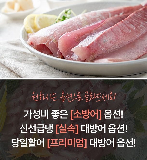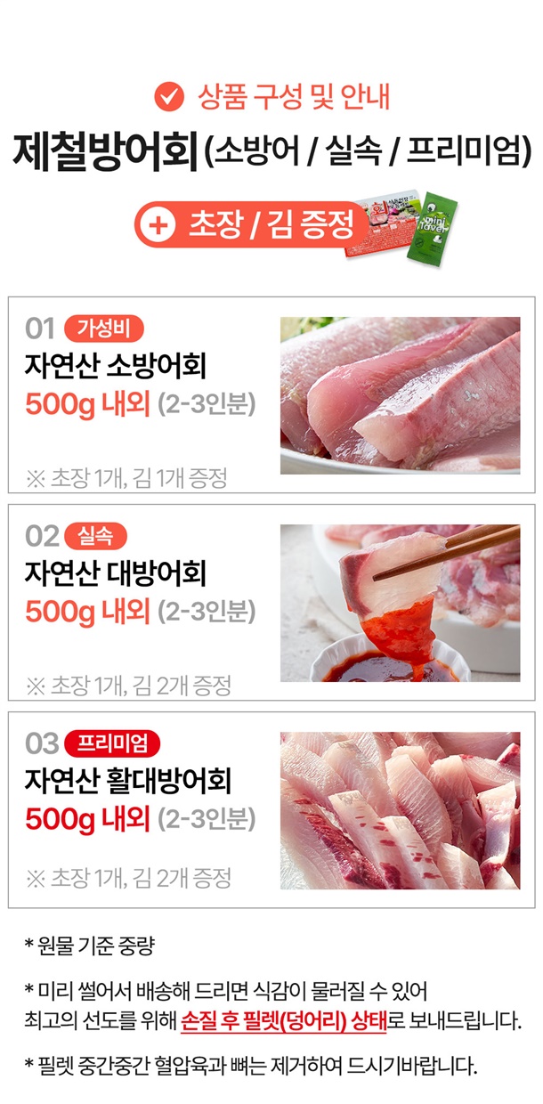 | 1.상품구성 | 소방어500g / 대방어 500g(실속) / 대방어 500g(프리미엄) |