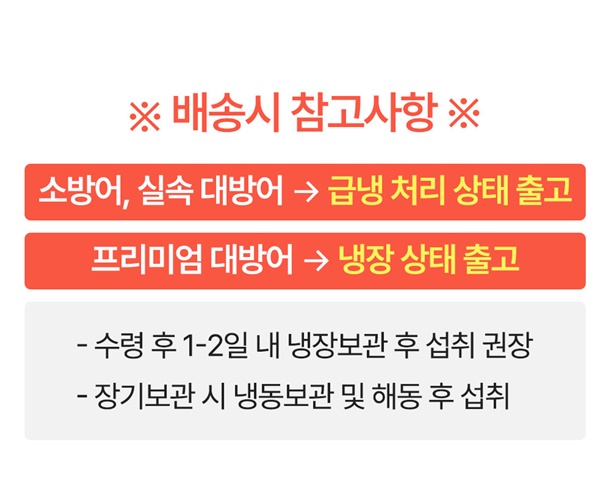 | 1.보관방법 | 소방어 ,실속대방어 : 냉동보관 / 프리미엄대방어 : 냉장보관,장기보관시 냉동보관 |