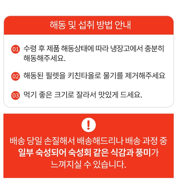 | 1.소비자안전을 위한 주의사항 | ㆍ소방어,실속대방어: 수령 즉시 냉동 보관 권장 드립니다. 이미 냉동된 바 있으니 해동 후 재냉동은 권장 드리지 않습니다. / ㆍ방어 공통 : 수작업으로 최대한 깔끔하게 손질하여 보내드리나, 간혹 필렛 내 가시가 발견될 수 있으니 제거 후 섭취 부탁드립니다. / 간혹 방어 내에 존재하는 기생충이 있어 빨간색 실 모양이나 핏자국이 있을 수 있으니 해당 부분은 제거 후 섭취해 주세요. / 방어 특성상 핏물이 발생될 수 있으니 키친타월로 가볍게 닦아주시고, 혈압육과 뼈는 제거하여 섭취 부탁드립니다. |