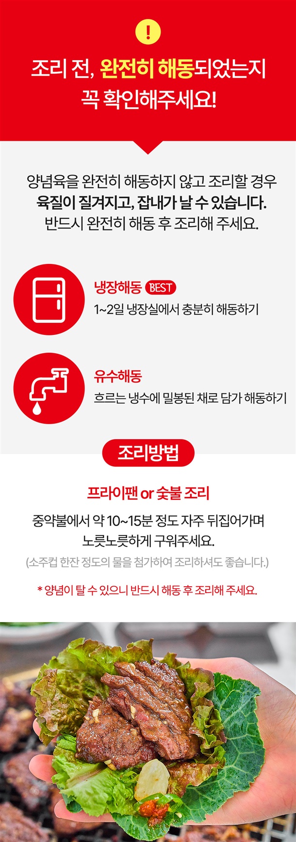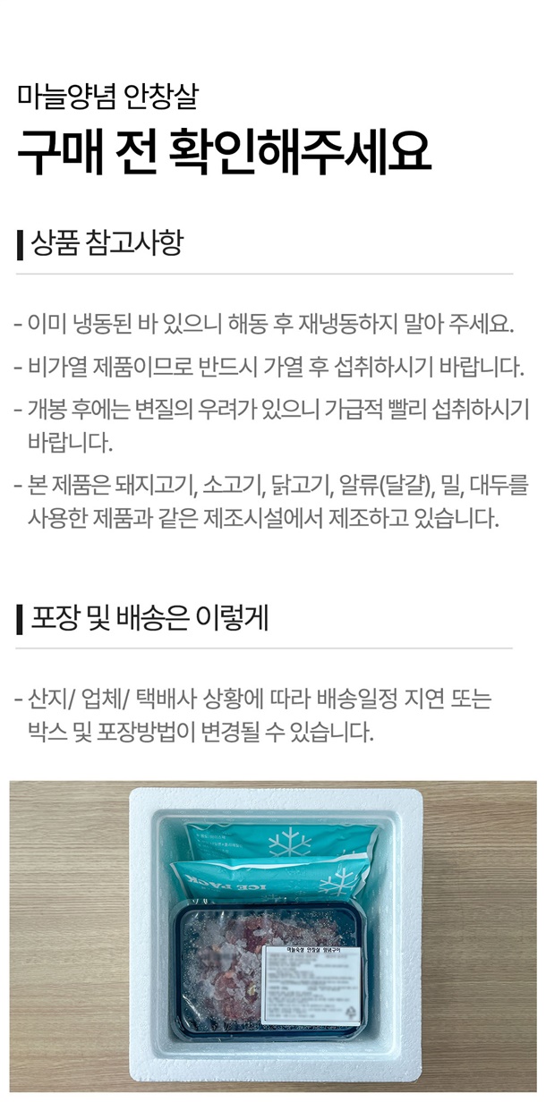 소비자안전을 위한 주의사항 ㆍ배송 직후 당일 조리할 경우 냉장실에, 이외의 경우 냉동실에 보관해 주시기 바랍니다. ㆍ본 제품은 돼지고기, 닭고기, 알류(달걀), 밀, 대두를 사용한 제품과 같은 제조 시설에서 제조하고 있습니다. ㆍ비가열 제품이므로 반드시 가열 후 섭취하시기 바랍니다.